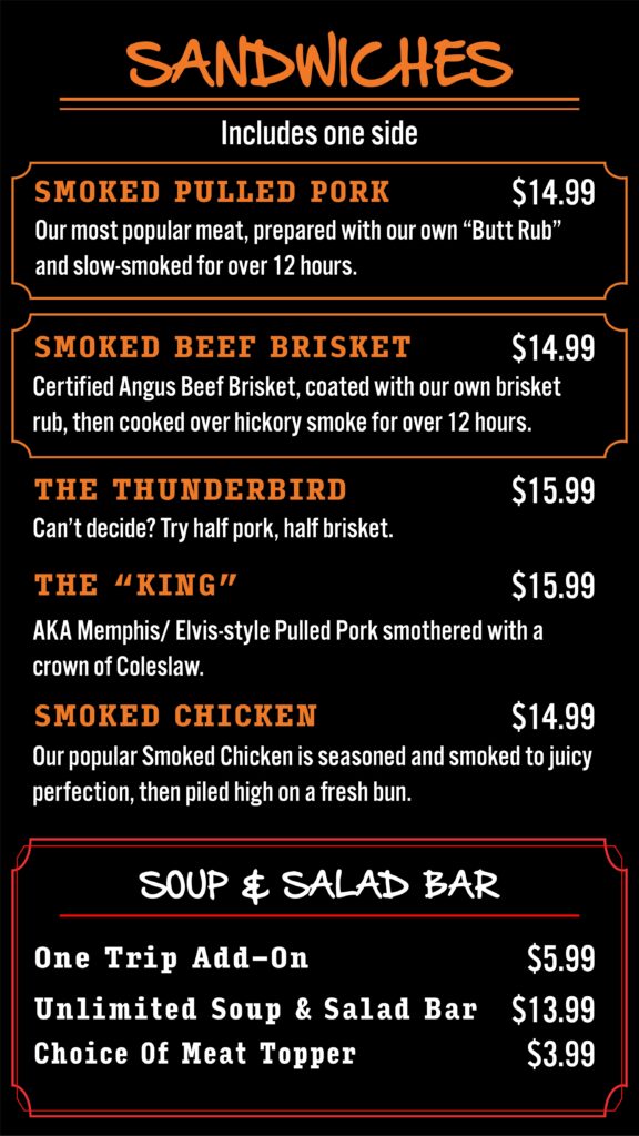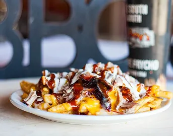Popular for those on the go! Flour tortilla stuffed with a generous portion of our award winning meats, Smokey BBQ Beans, Crispy Fries and Coleslaw, then drizzled with our handcrafted sauces.