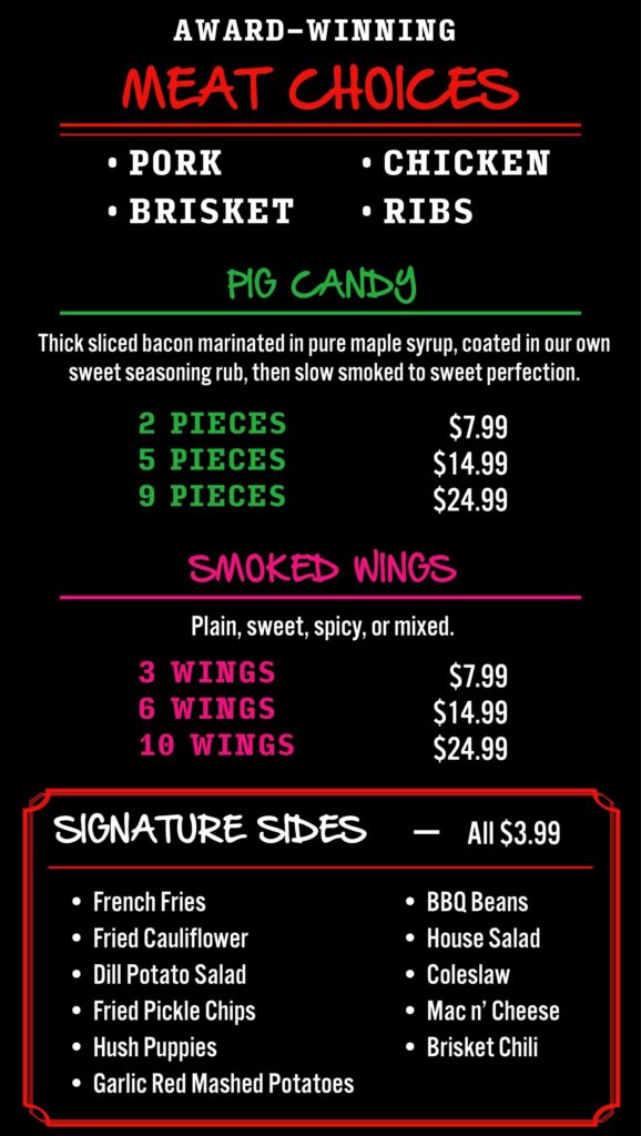 No divided plate here! Garlic Red Mashed Potato-Mac’n Cheese and BBQ Beans, then a blanket smoked meat and a touch of Coleslaw. You sauce how you like at our BBQ sauce Bar! Comfort foom at its BBQ Best!